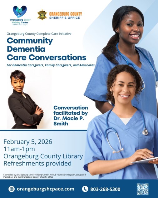 There will be a community dementia care conversation directed by Dr. Macie P. Smith in Orangeburg on Thursday, February 5th from 11 a.m. to 1 p.m. at the Orangeburg Library.
