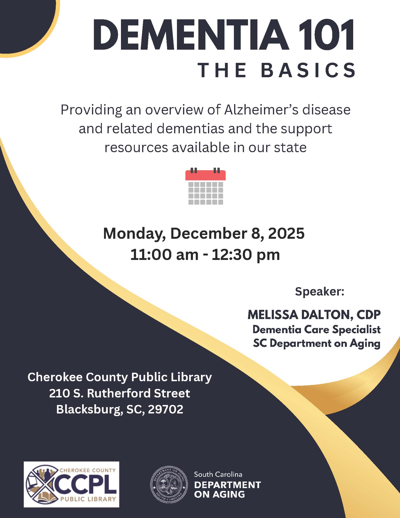 The presentation is by South Carolina Department on Aging Dementia Care Specialist Melissa Dalton. The event is from 11 a.m. to 12:30 p.m. at the Cherokee County Public Library, located at 210 S. Rutherford Street Blacksburg, SC 29702.