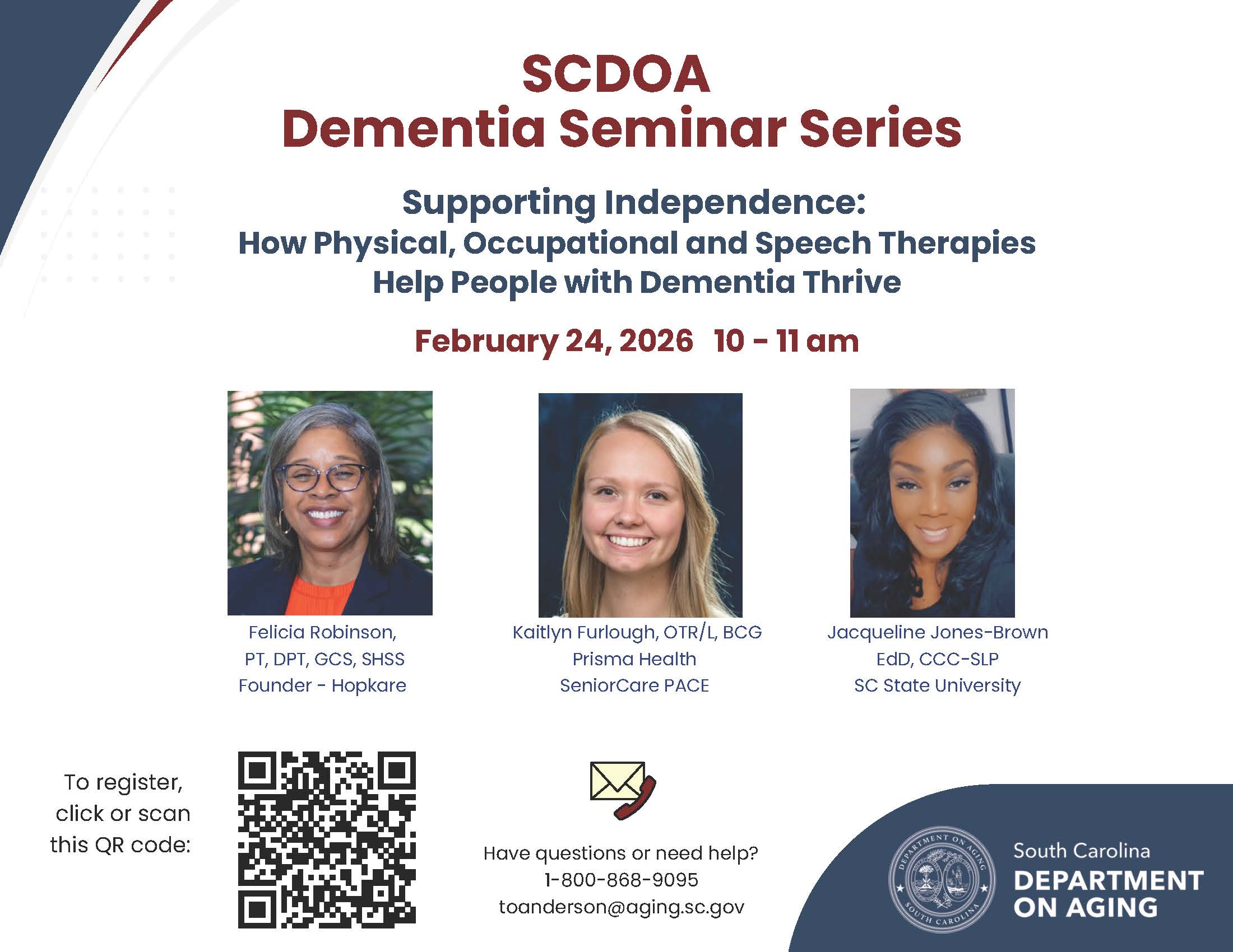 Join us for this free webinar where experts in the field will walk us through the benefits of physical, occupational and speech therapies for people living with dementia.