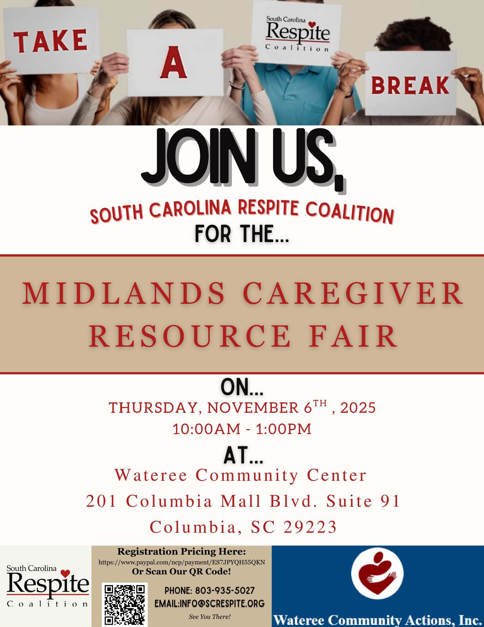 Join the South Carolina Respite Coalition for the Midlands Respite Resource Fair on Thursday, November 6, 2025.